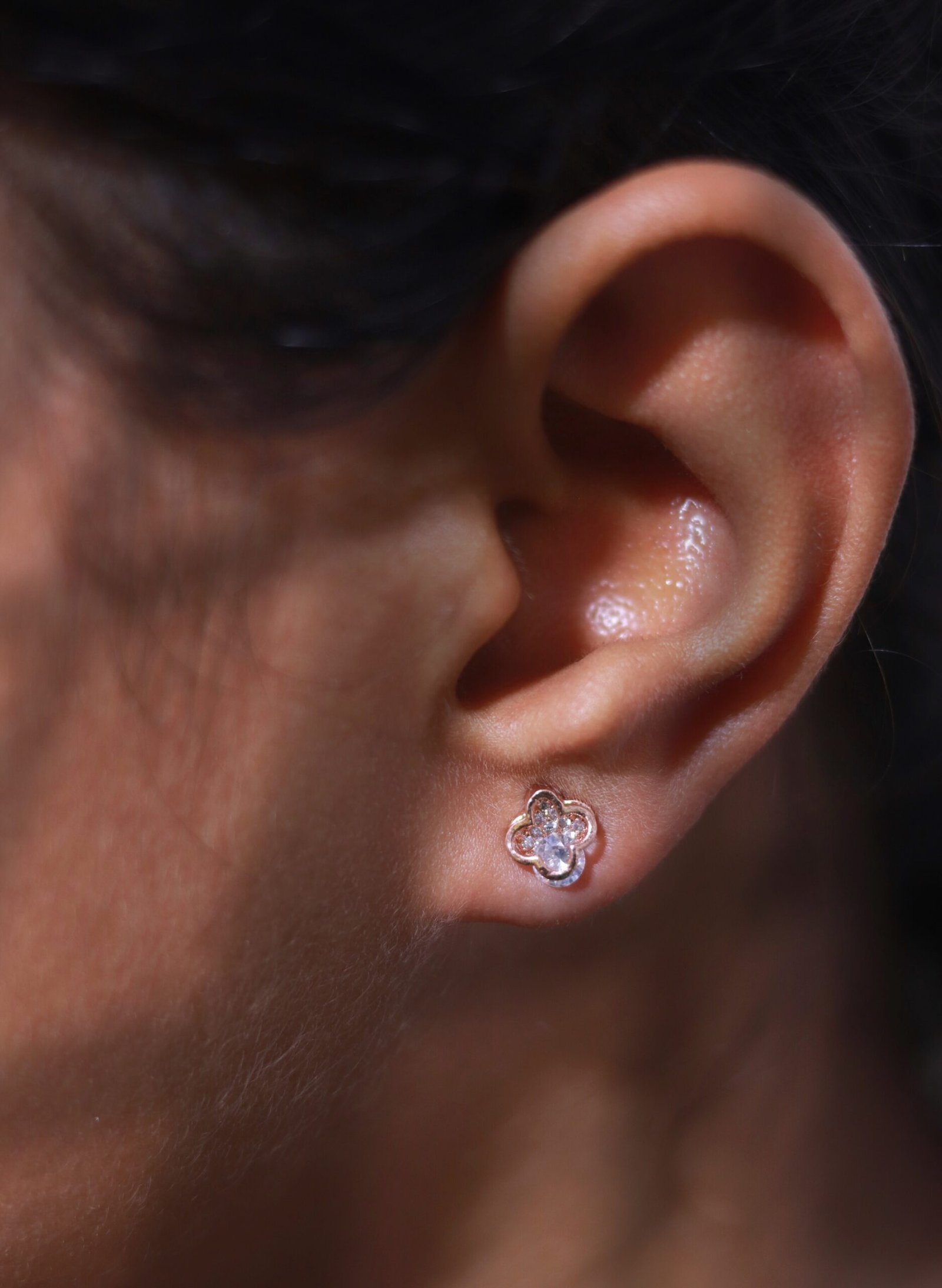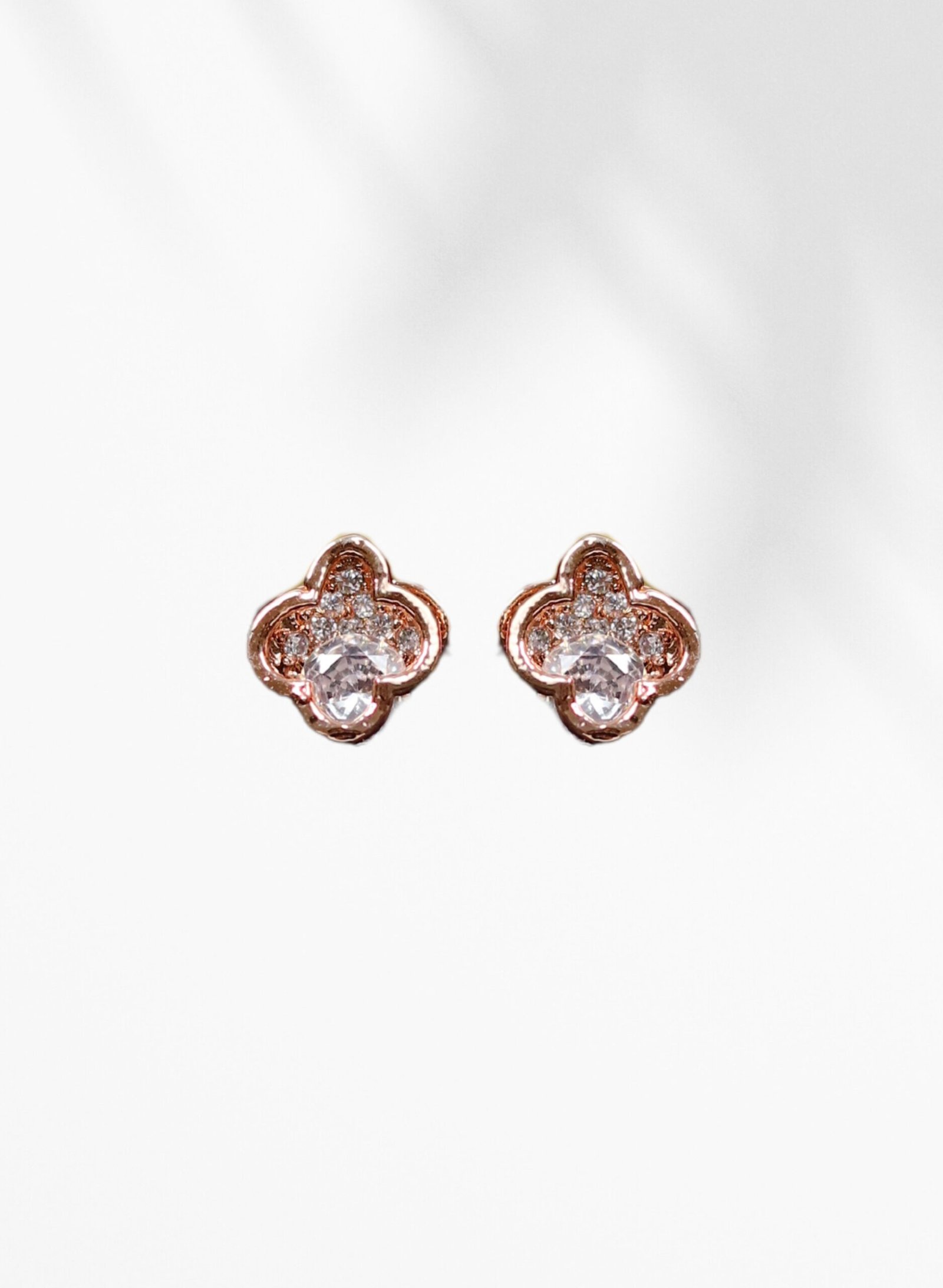 Delicate and timeless, these rose gold clover-shaped stud earrings add a graceful touch to any look. Designed with a clover silhouette symbolizing luck and elegance, each earring is adorned with shimmering crystals that catch the light beautifully. The center features a brilliant cut stone, bringing extra sparkle to this refined piece. Perfect for daily wear or as a charming gift, these earrings blend sophistication with a hint of whimsy.