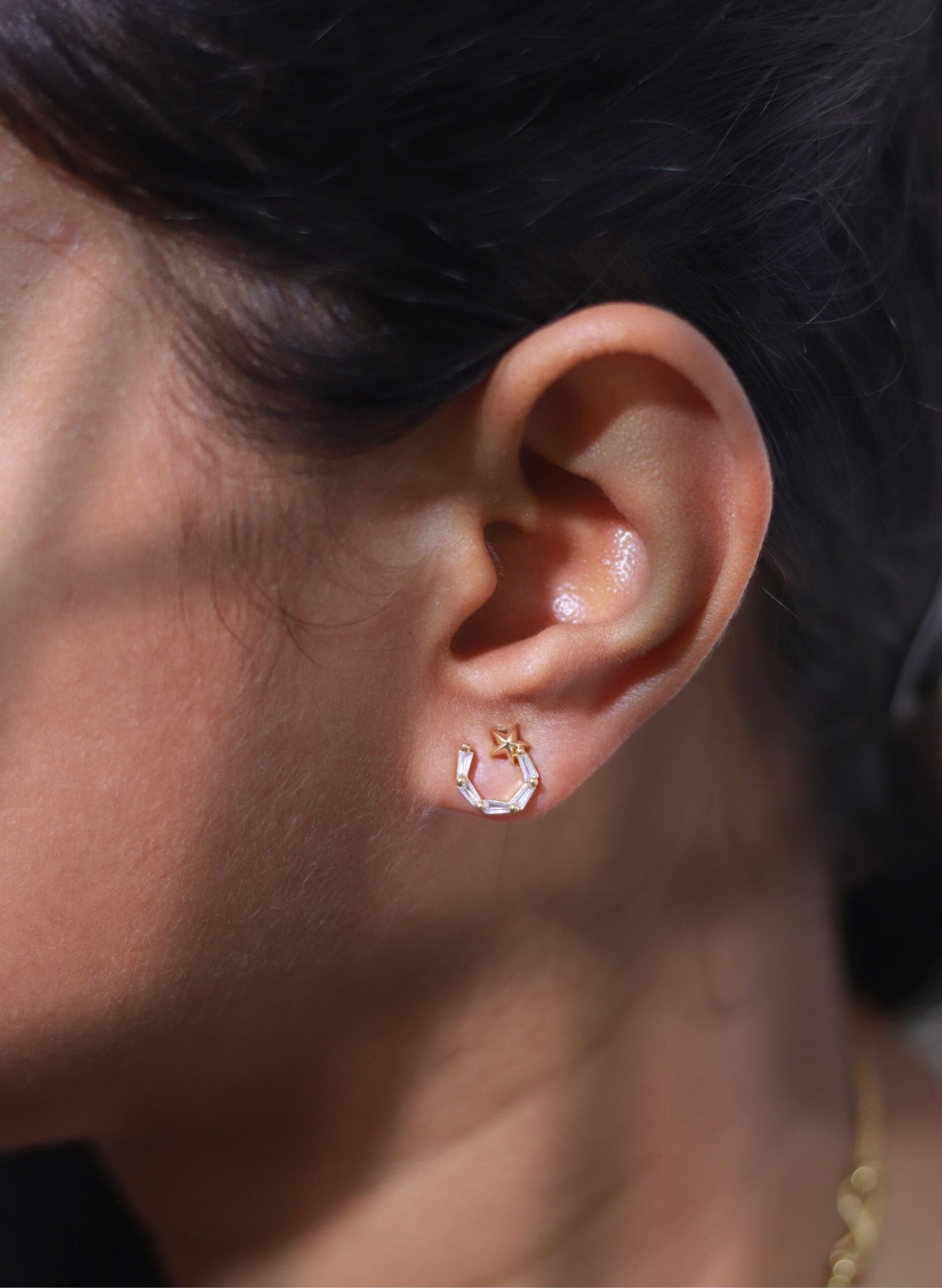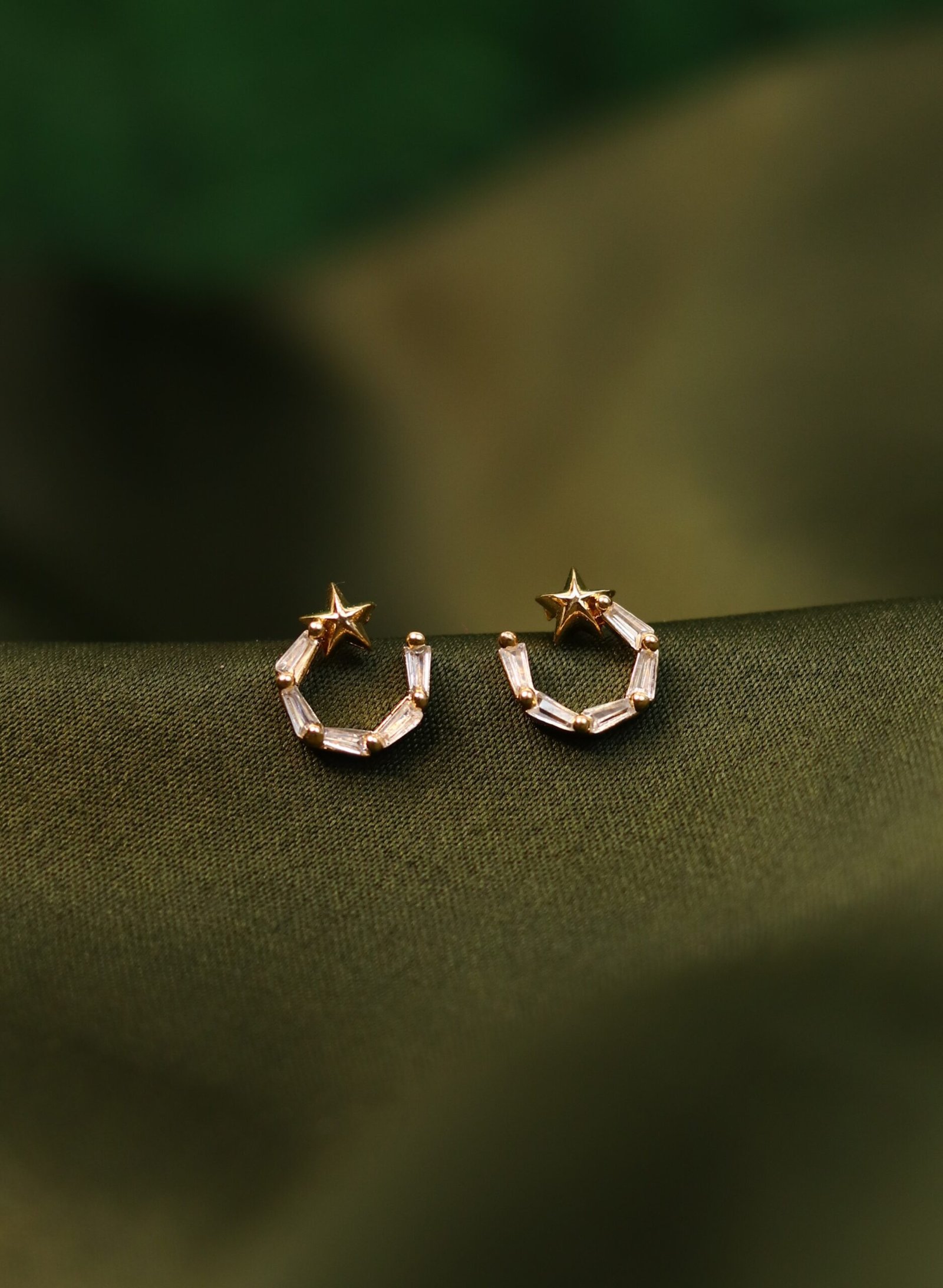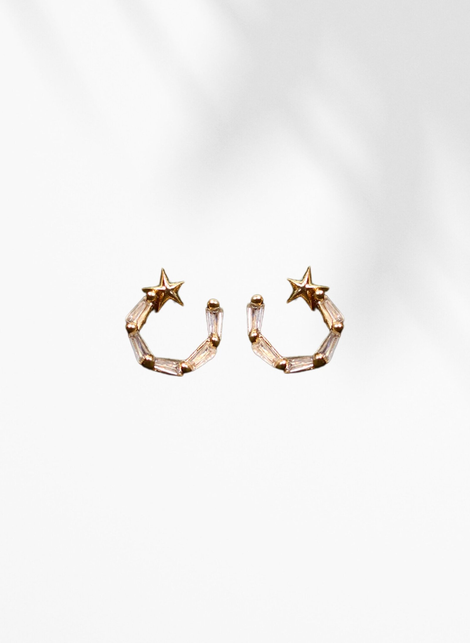 Step into the spotlight with these celestial-inspired geometric hoop earrings, crafted with a star detail and elegant baguette-cut crystals. The unique semi-hoop shape brings a modern twist to classic sparkle—perfect for parties, festive events, or glam nights out.